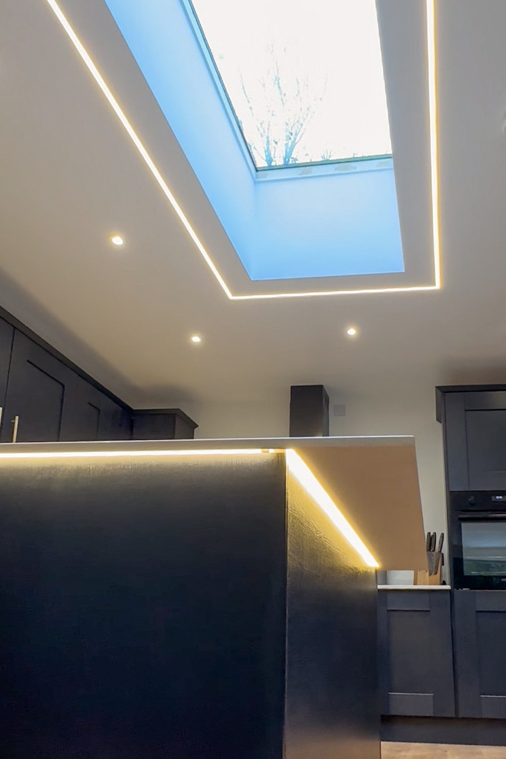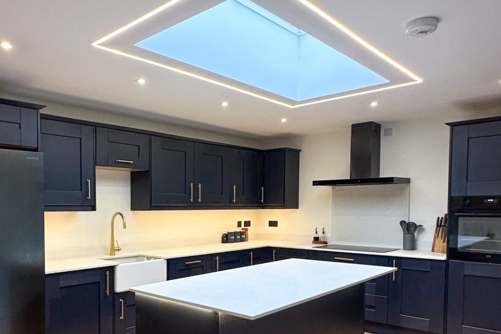 MKM Redruth supplied the full materials package, including the kitchen, where we also added a few bespoke in-house touches such as the LED-lit wine cabinet and worktop detailing.